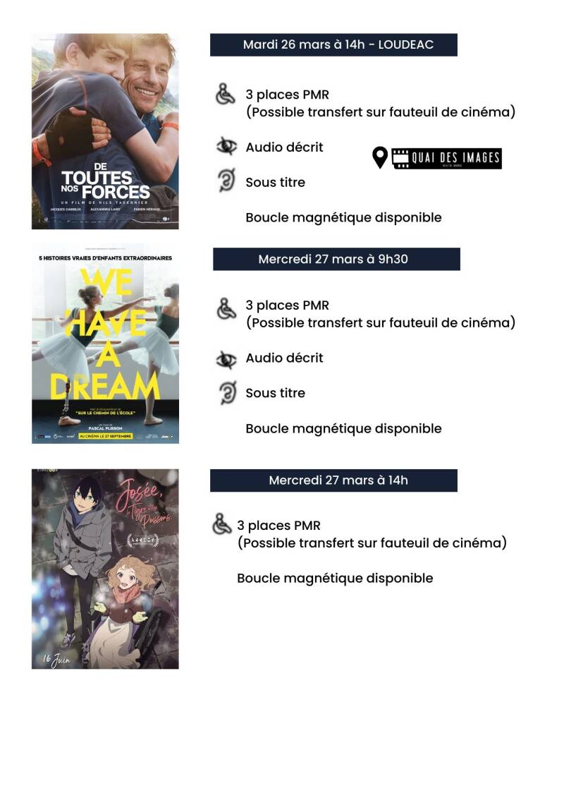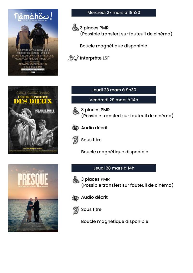 Les films sont audiodécrits, sous titrés Français, accessible PMR, boîtiers filmeo mis à disposition